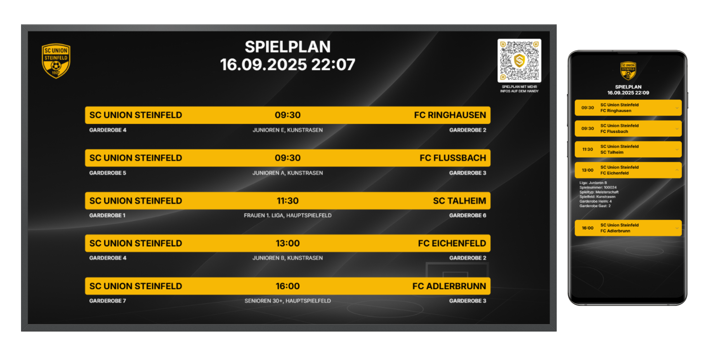 Zuschauer, Trainer und Vereinswirtschaft profitieren gleichermassen, denn aktuelle Spiel- und Garderobenpläne können live und gut sichtbar auf einem Screen im Clubhaus angezeigt werden.